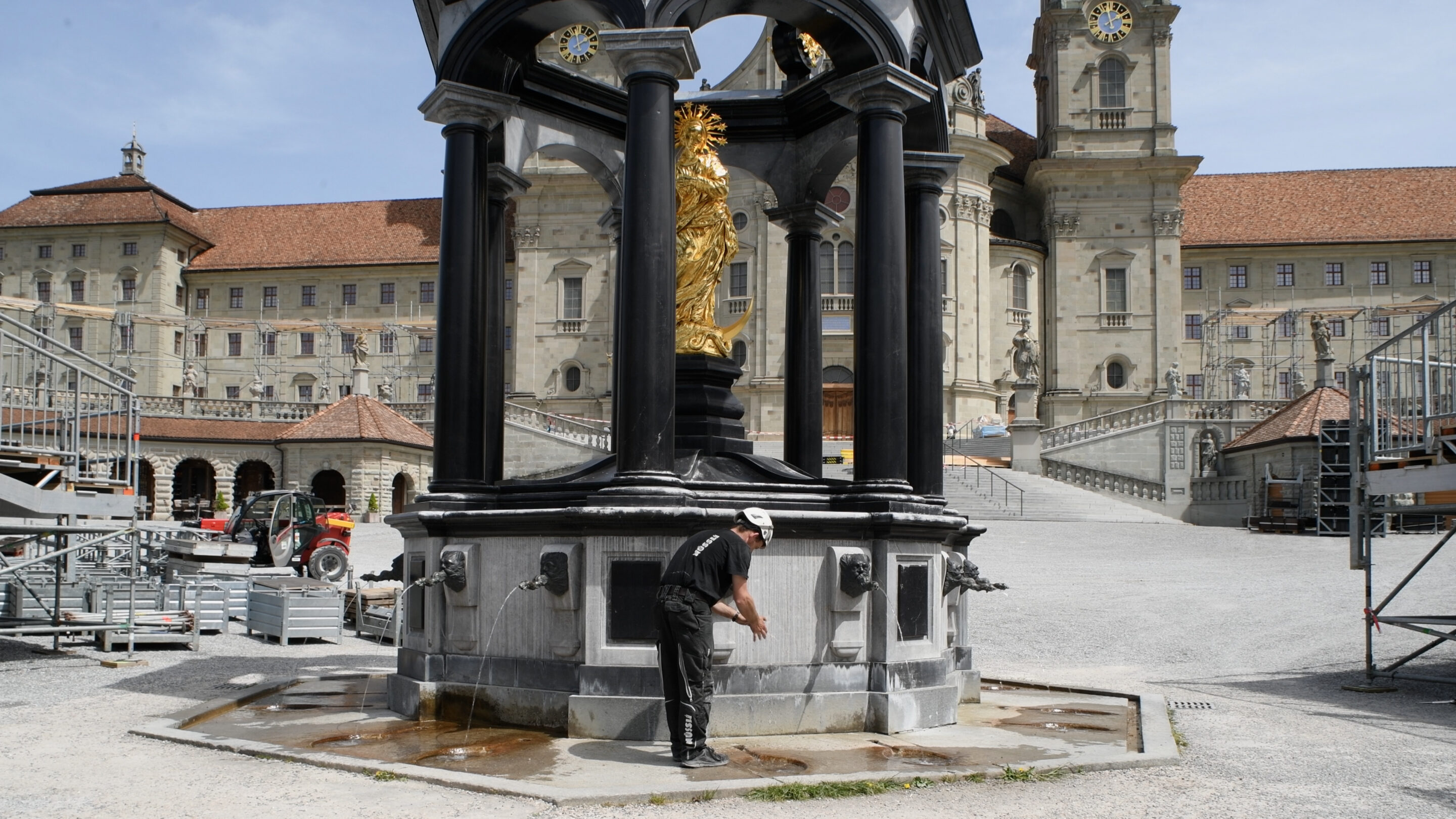 Die Klosteranlage zeugt von einer reichen Baukultur, die von Gläubigen und Nichtgläubigen, von Einheimischen und Weitgereisten besucht wird. Die Anlage umfasst grosse repräsentative Bauten, aber auch kleinere Bauten wie den Marienbrunnen. In jeder Schweizer Stadt oder Gemeinde gibt es zahlreiche Brunnen. Sie löschen kostenlos den Durst mit sauberem Trinkwasser. Die kleinen Wasserbecken im Boden des Marienbrunnens ermöglichen es auch Hunden, frisches Wasser zu trinken.