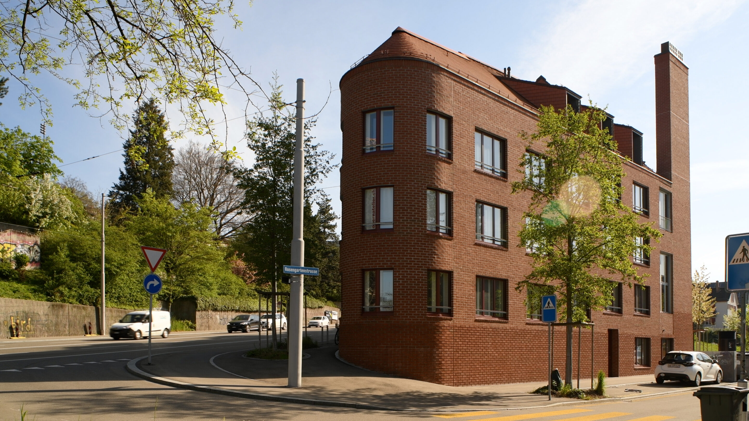 Die Gesetzgebung macht das Bauen an stark befahrenen Strassen zu einer heiklen Angelegenheit. Atelier Scheidegger Keller antwortet darauf mit einem kompakten, massiven Riegel, der dem Gefälle und der Krümmung der Strasse folgt. Der langgestreckte Bau besteht aus zehn Häusern. Eine Schicht aus Backsteinen umhüllt ein robustes Tragwerk aus betonierten Stützen und Decken. Zum Verkehr hin schirmen Kastenfenster den Lärm ab – aussen mit Schallschutz-, innen mit Wärmeschutzverglasung.