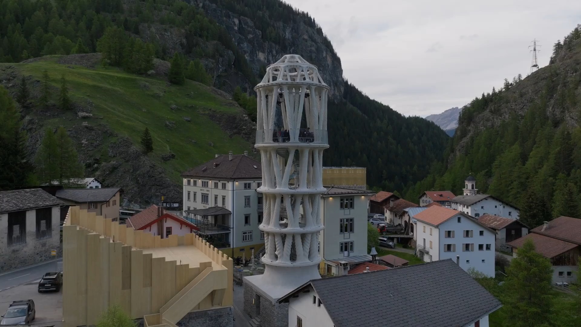 Der für Zirkularität konzipierte Weisse Turm verfügt über lösbare Verbindungen, die es ermöglichen, ihn nach seiner fünfjährigen Nutzung in Mulegns zu demontieren und an einem neuen Standort wieder aufzubauen. Um die Dauerhaftigkeitsprobleme zu vermeiden, die die Karbonatisierung bei klassischem, stahlbewährtem Beton verursachen würde, kommt beim Tor Alva Edelstahl für die Bewehrung zum Einsatz, was ein neues Paradigma für nachhaltiges Design unter Verwendung von 3D-Druck darstellt.