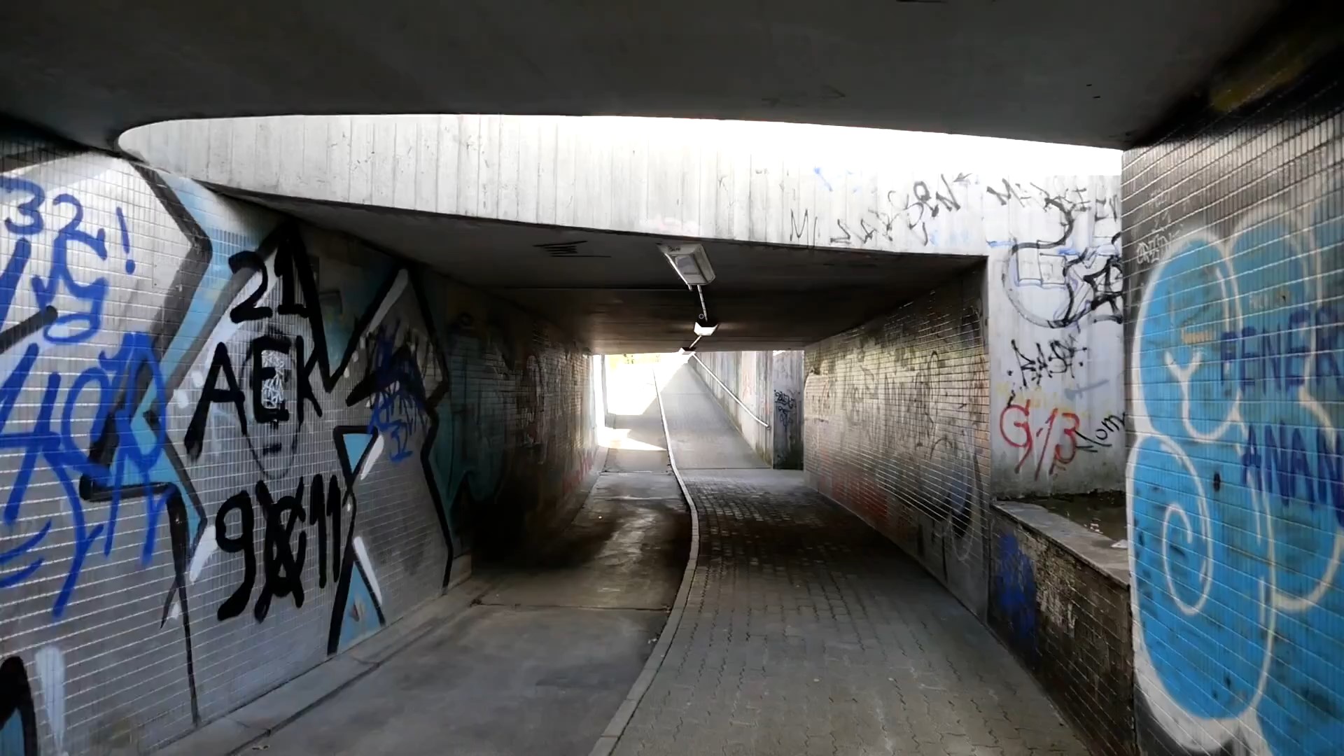 Die Unterführung ist funktional gestaltet. Die Wände sind mit Graffitis besprayt und am Boden liegen einzelne Zigarettenstummel. Doch zugleich entsteht eine spannende Lichtsituation. Vor der Unterführung stehend, geht der Blick ins Dunkle. Das Ende ist aber bereits um die Kurve sichtbar. Ein leichtes Gefälle zieht einem förmlich in den kurzen Tunnel, der auf halbem Weg ein weiterer Lichteinfall zulässt über ein rundes gebogenes Oberlicht und zwei seitlichen Treppenaufgängen.