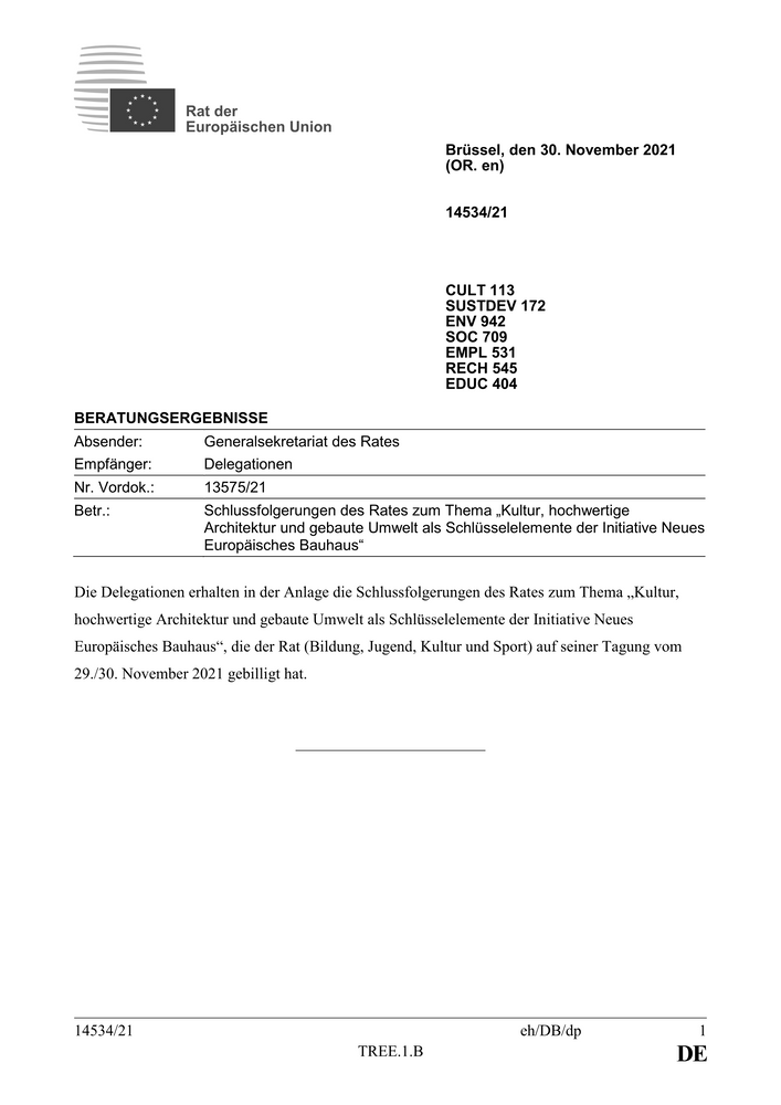Der Rat der Europäischen Union verabschiedete 2021 die «Schlussfolgerungen des Rates zum Thema Kultur, hochwertige Architektur und gebaute Umwelt als Schlüsselelemente der Initiative Neues Europäisches Bauhaus». Der EU-Rat unterstützt darin ausdrücklich die acht Qualitätskriterien des Davos Qualitätssystems für Baukultur.