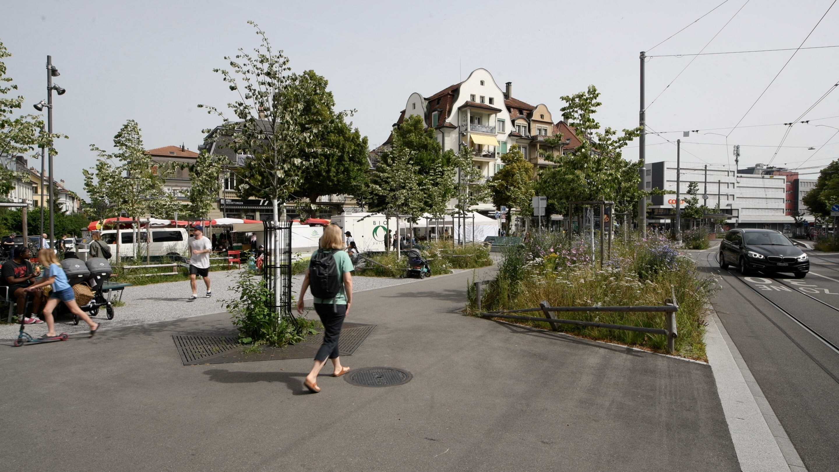 Les arbres nouvellement plantés sur la Breitenrainplatz et autour du giratoire atténuent la prédominance de la circulation. Dans quelques années, lorsqu’ils auront poussé et que leurs couronnes se seront agrandies, ils formeront un couvert végétal qui donnera de l’ombre. Les surfaces désimperméabilisées agissent aussi contre la chaleur et laissent l’eau s’infiltrer.